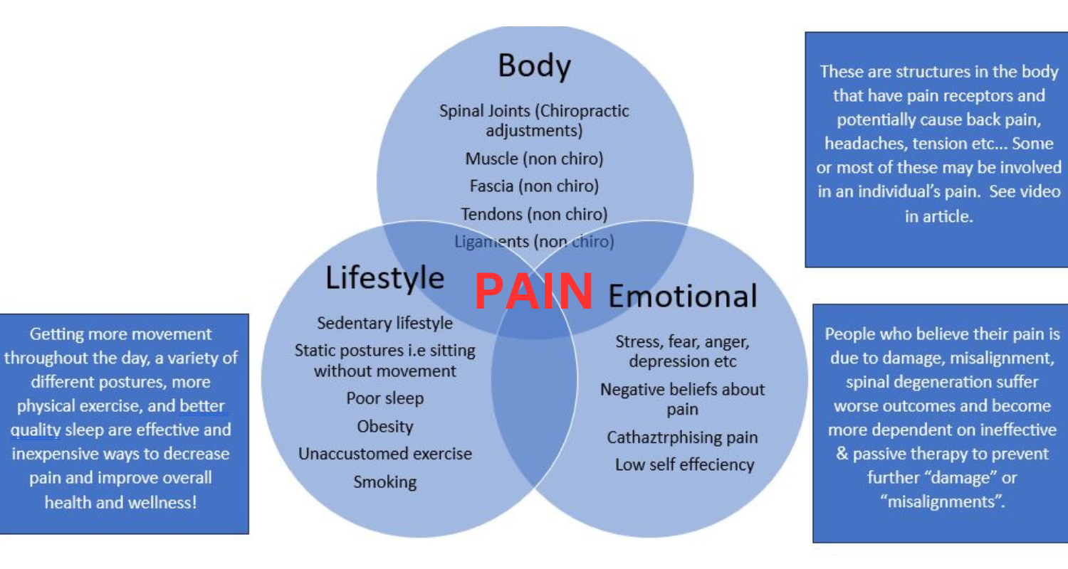 Educating pain sufferers that pain may not be just a physical problem and may involve our mental/emotional health and our lifestyles. How we perceive the cause of our pain can greatly impact our emotional & physical response to pain and can have a dramatic effect on the amount of pain we feel. Research shows, that people who attribute their pain as a result of their spine being damaged or misaligned often suffer more pain and for longer periods and spend more money on ineffective therapies compared to people who are educated with a more evidence-based and holistic understanding of their pain.